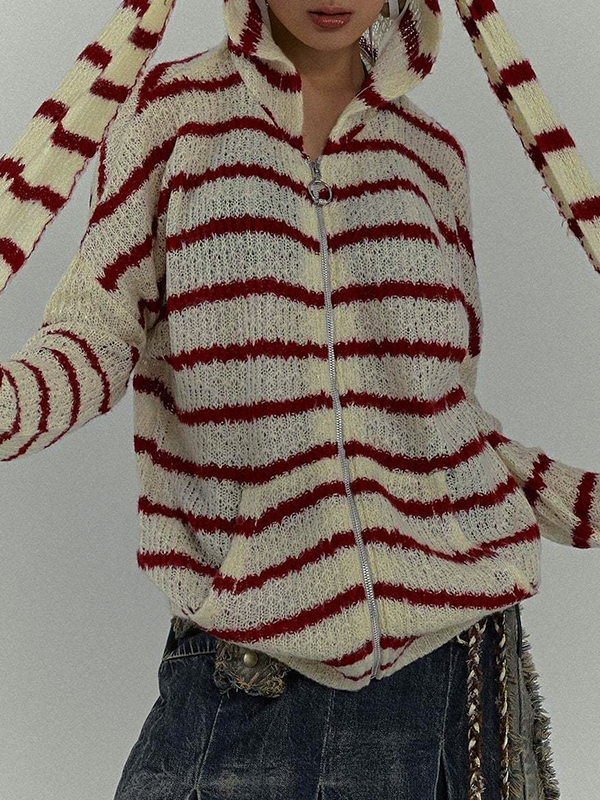 Rabbit Ear Styling Hooded Stripe Cardigan