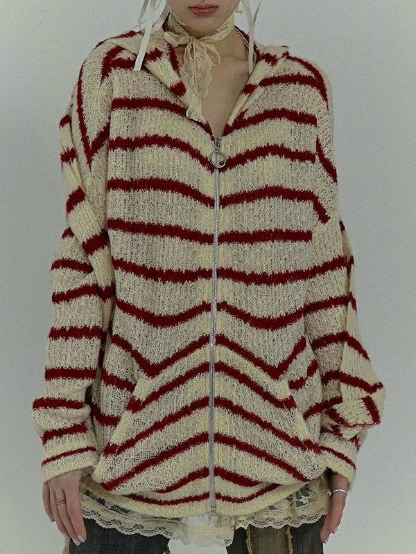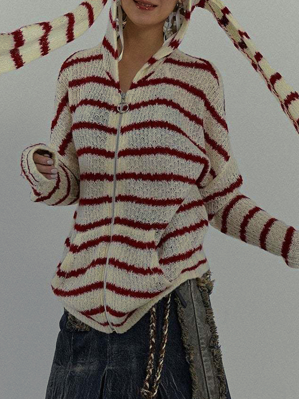 Rabbit Ear Styling Hooded Stripe Cardigan