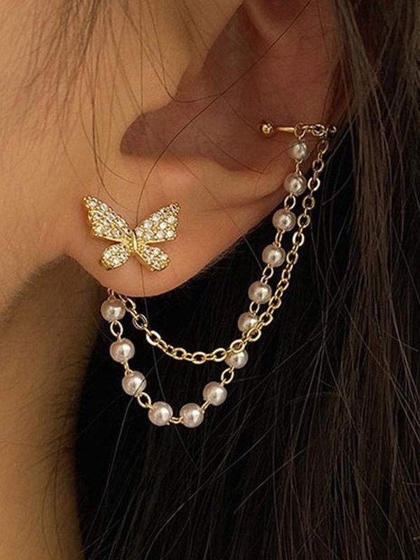 Faux Pearl Tassel Rhinestone Butterfly Earring
