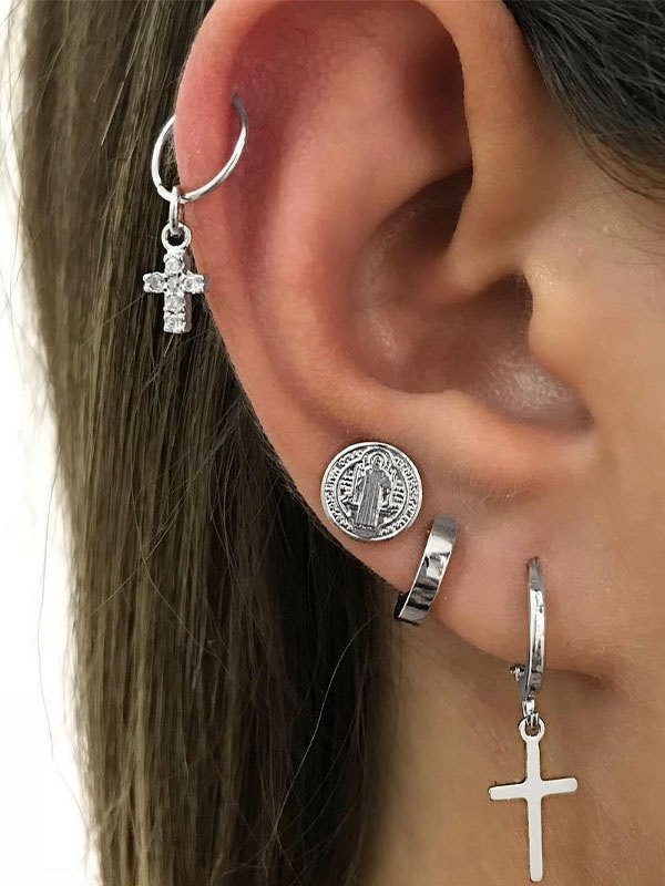4pcs Silver Cross Hoop Earring Set