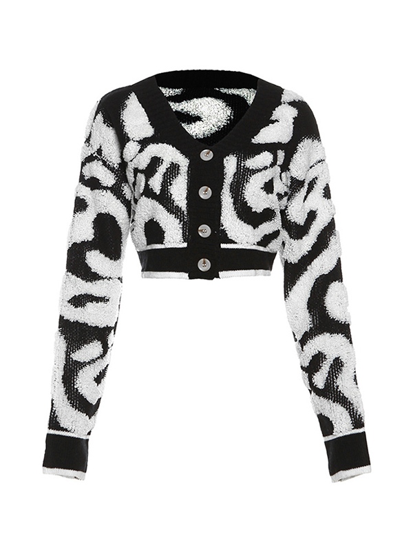 Contrast Color Flocking Print V Neck Short Cardigan