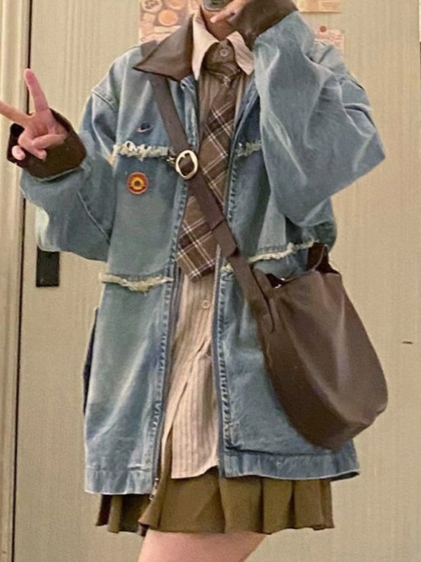 Be the first to review “Vintage Contrast Splice Raw Trim Zip Up Denim Jacket”