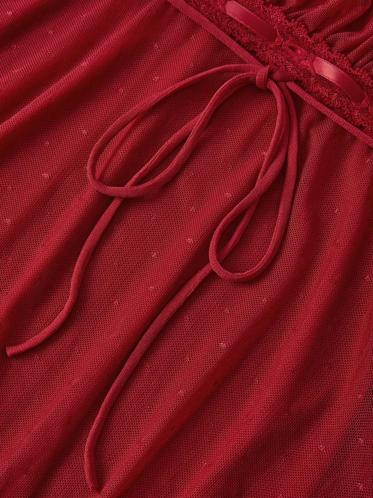 -Unique Design: Features a lace paneling under the bust that goes through with a strap, adding a touch of sexiness and sophistication to the piece. The slightly ruched bust and tie front fastening provide a flattering and adjustable fit, while the lettuce edge detailing adds a playful and feminine touch.